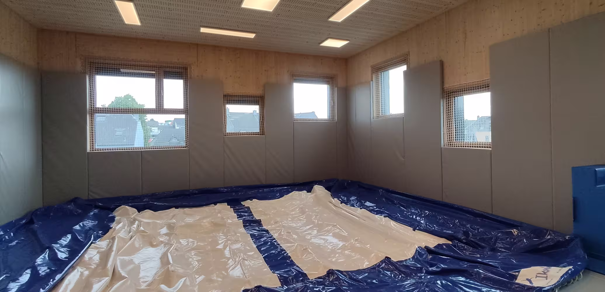 Le concept statique du bâtiment repose sur un radier général armé installé sur un soubassement compacté, constitué d’une substitution de sol renforcée par une géogrille, avec un isolant mis en œuvre sur toute la surface. La structure porteuse associe des noyaux ponctuels en béton armé pour les cages d’escaliers et d’ascenseur, à une ossature majoritairement en bois. Les murs porteurs en panneaux de bois massif présentent une finition intérieure apparente. Les planchers sont réalisés en caissons préfabriqués, posés sur des éléments en lamellé-croisé (CLT). Les plafonds intègrent une sous-face perforée avec isolation en liège, assurant un confort acoustique optimal. Enfin, une partie de la toiture accueille une aire de jeu protégée par une couverture en charpente métallique.