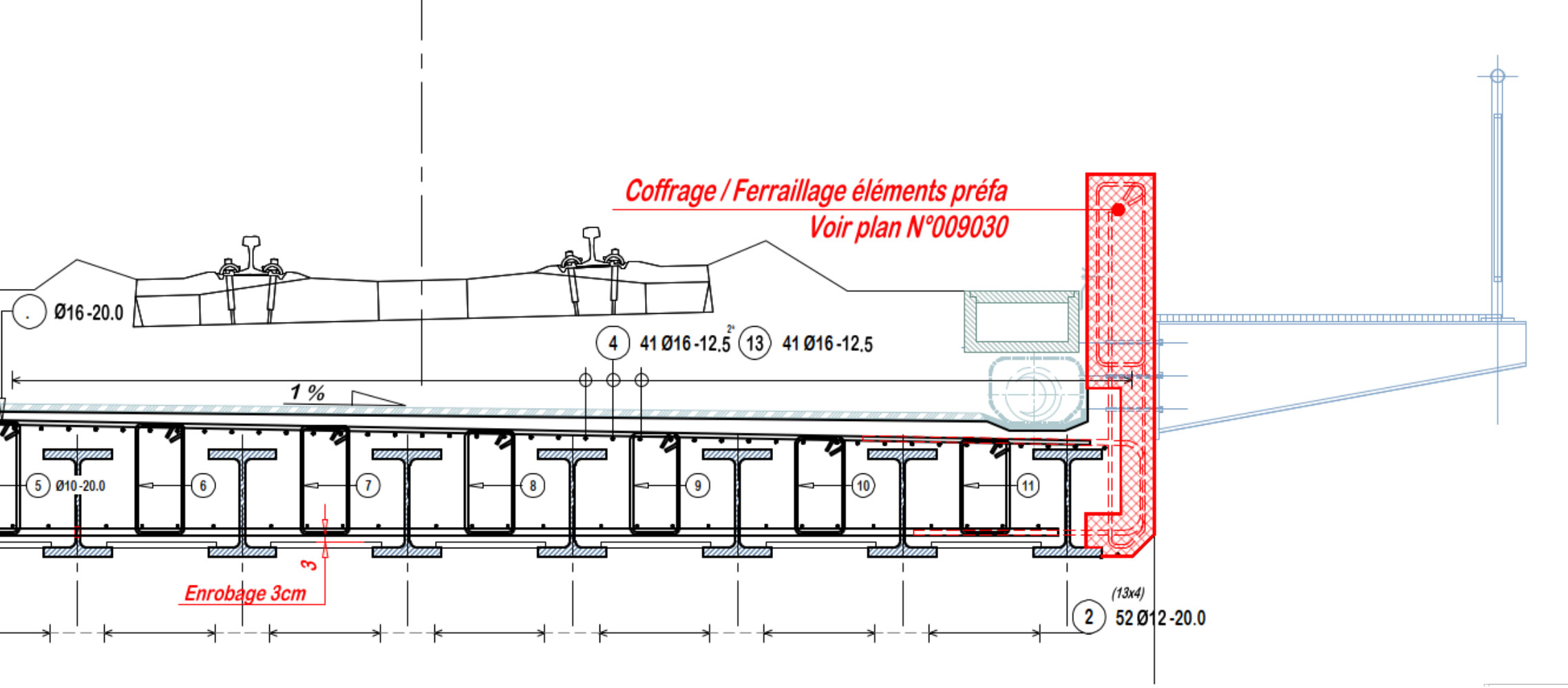 La nouvelle structure se compose d’un tablier mixte acier-béton d’une épaisseur maximale de 65 cm à mi-travée, formé de profilés métalliques HEM450 enrobés dans du béton armé. L’ensemble repose sur des fondations superficielles, partiellement reprises depuis l’existant, et renforcées par des micropieux afin d’assurer une stabilité optimale sous charge.